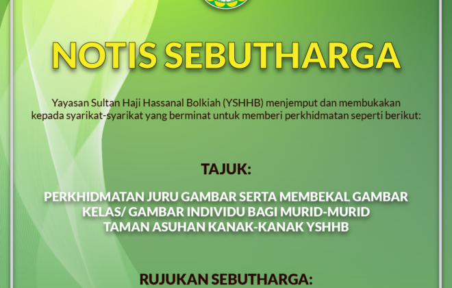 Pembekal yang ingin menyertai sebarang tawaran/sebutharga atau yang dipilih oleh Yayasan Sultan Haji Hassanal (YSHHB) hendaklah mendaftarkan syarikat ke YSHHB.