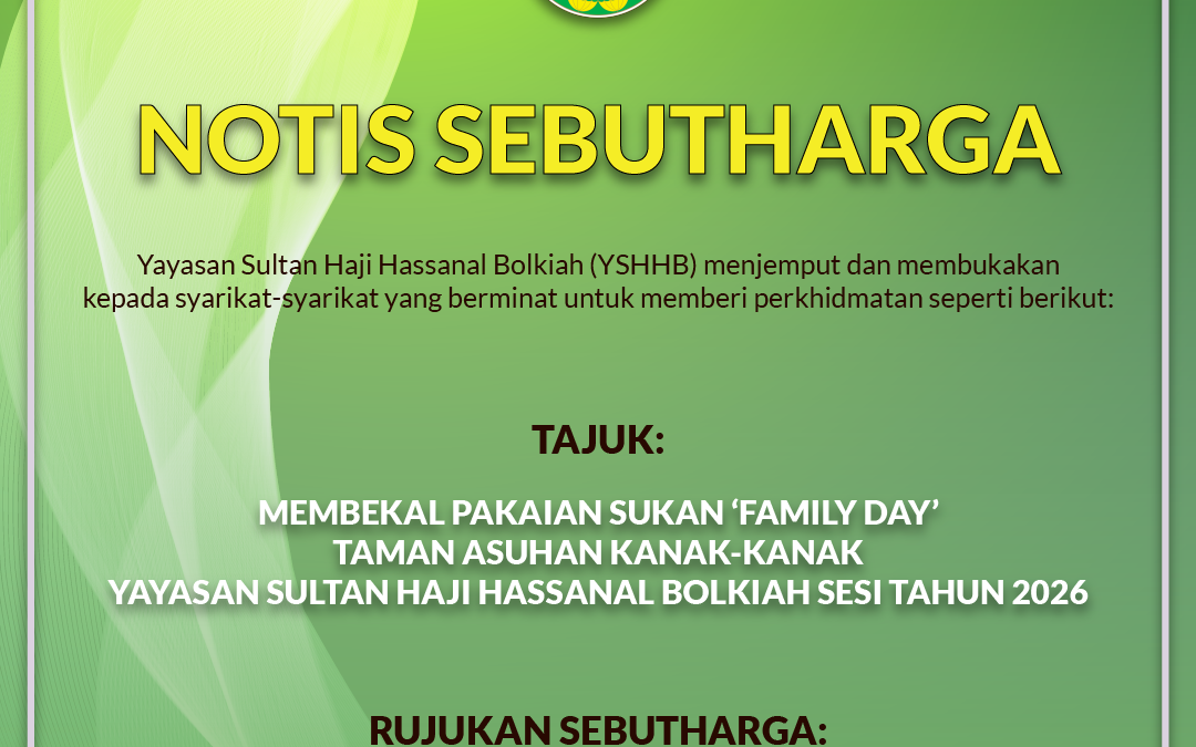 | Tajuk: | MEMBEKAL PAKAIAN SUKAN ‘FAMILY DAY’ TAMAN ASUHAN KANAK-KANAK YAYASAN SULTAN HAJI HASSANAL BOLKIAH SESI TAHUN 2026 |