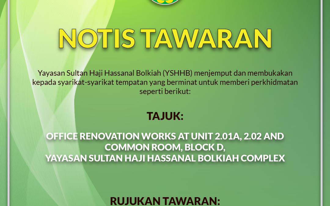| Tajuk tawaran: | OFFICE RENOVATION WORKS AT UNIT 2.01A, 2.02 AND COMMON ROOM, BLOCK D, YAYASAN SULTAN HAJI HASSANAL BOLKIAH COMPLEX |
