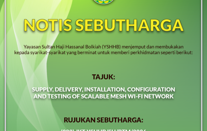 | Alamat dan Tarikh Pengambilan Dokumen Tawaran: | Kaunter Pentadbiran, Block A, Tingkat Dua, Kompleks Bangunan Yayasan Sultan Haji Hassanal Bolkiah, Jalan Pretty, Bandar Seri Begawan, BS8711, Negara Brunei Darussalam |