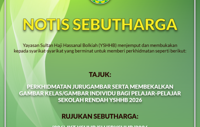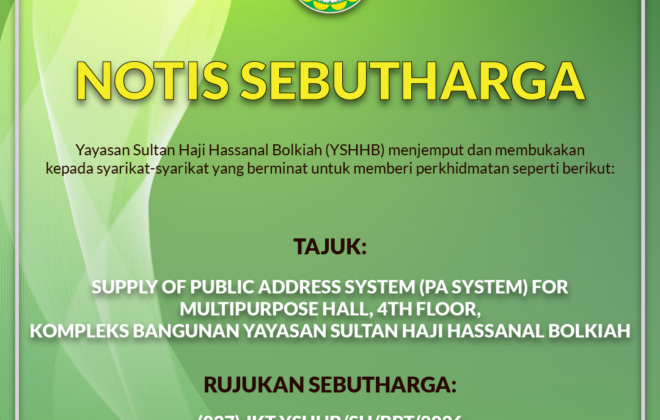 Dokumen Tawaran hendaklah dihantar dan dimasukkan ke dalam “Tender Box” yang terletak di Lobi Ibu Pejabat YSHHB, Jalan Perdana Menteri, Bandar Seri Begawan BA1511 pada atau sebelum pukul 2:30 petang, Hari Rabu, 06 Mei 2026