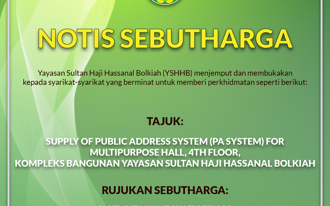 | Tajuk Sebutharga: | SUPPLY OF PUBLIC ADDRESS SYSTEM (PA SYSTEM) FOR MULTIPURPOSE HALL, 4TH FLOOR, KOMPLEKS BANGUNAN YAYASAN SULTAN HAJI HASSANAL BOLKIAH |